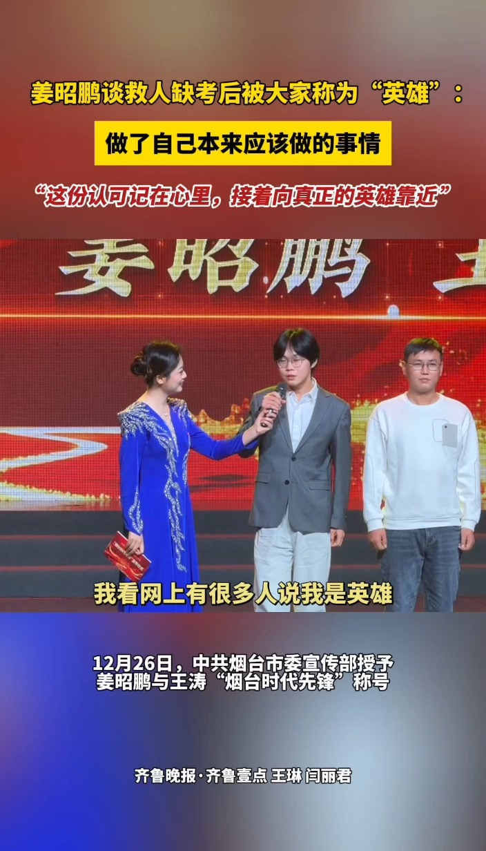 果然视频|姜昭鹏谈被称为“英雄”:做了自己本来应该做的事情齐鲁晚报·齐鲁壹点客户端 18:23原创12月26日,中共烟台市委宣传部授予刘杨、张葆春、姜昭鹏与王涛、长岛海洋生态文明综合试验区消防救援大队“烟台时代先锋”称号。姜昭鹏谈救人缺考后被大家称为“英雄”:恰逢其时,做了自己本来应该做的事情,“这份认可记在心里,接着向真正的英雄靠近”。 (齐鲁晚报·齐鲁壹点 王琳 闫丽君)