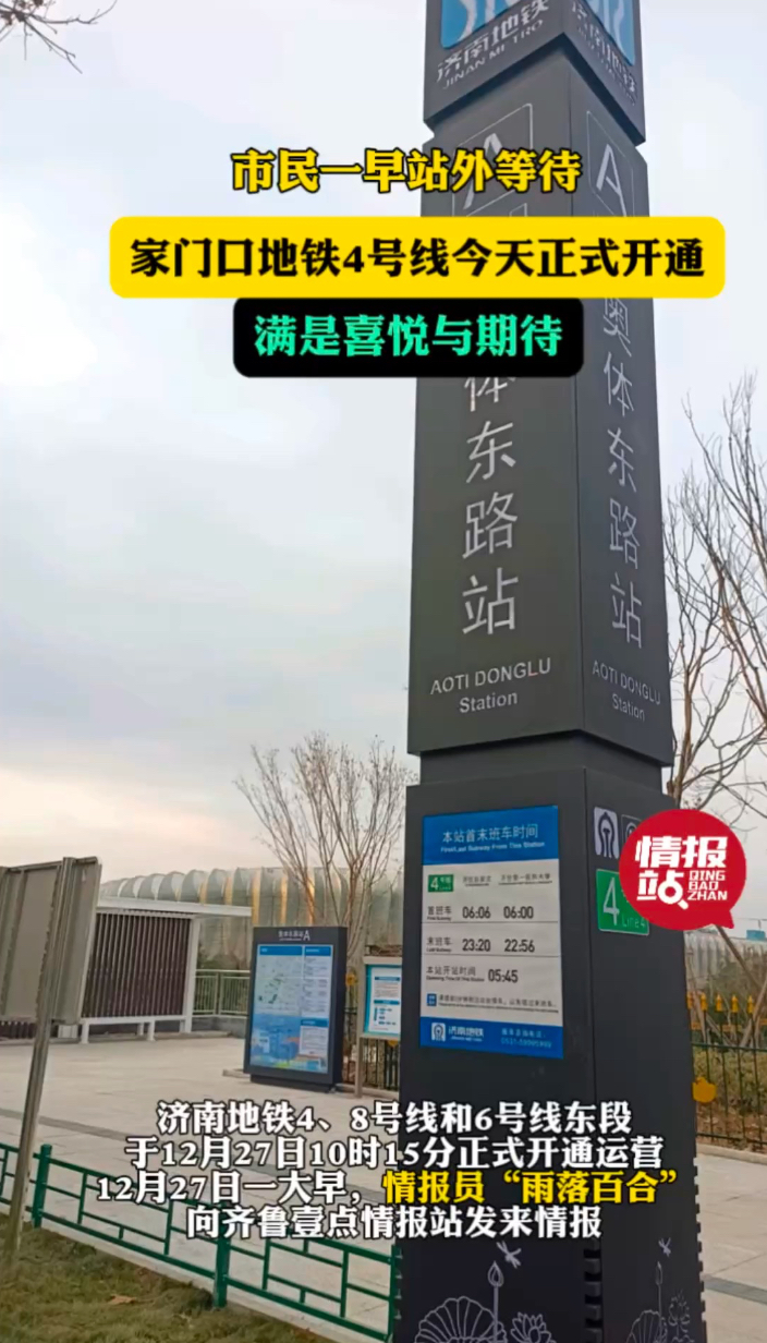 地铁情报站|家门口地铁4号线今天正式开通!市民一早站外等待 09:47 大众报业·齐鲁壹点 微信扫码扫码下载客户端济南地铁4、8号线和6号线东段于12月27日10时15分正式开通运营。12月27日一大早,情报员“雨落百合”向齐鲁壹点情报站发来情报,“盼望已久的贯穿济南东西的4号线,今天终于要开通了,这是济南交通的一件大事,所以一大早就来到4号线奥体东路站,等待乘坐第一辆车。”情报员说。