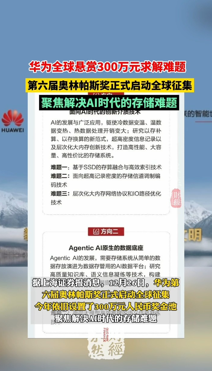 12月26日,华为第六届奥林帕斯奖正式启动全球征集。今年依旧设置了300万元人民币奖金池,聚焦解决AI时代的存储难题。
