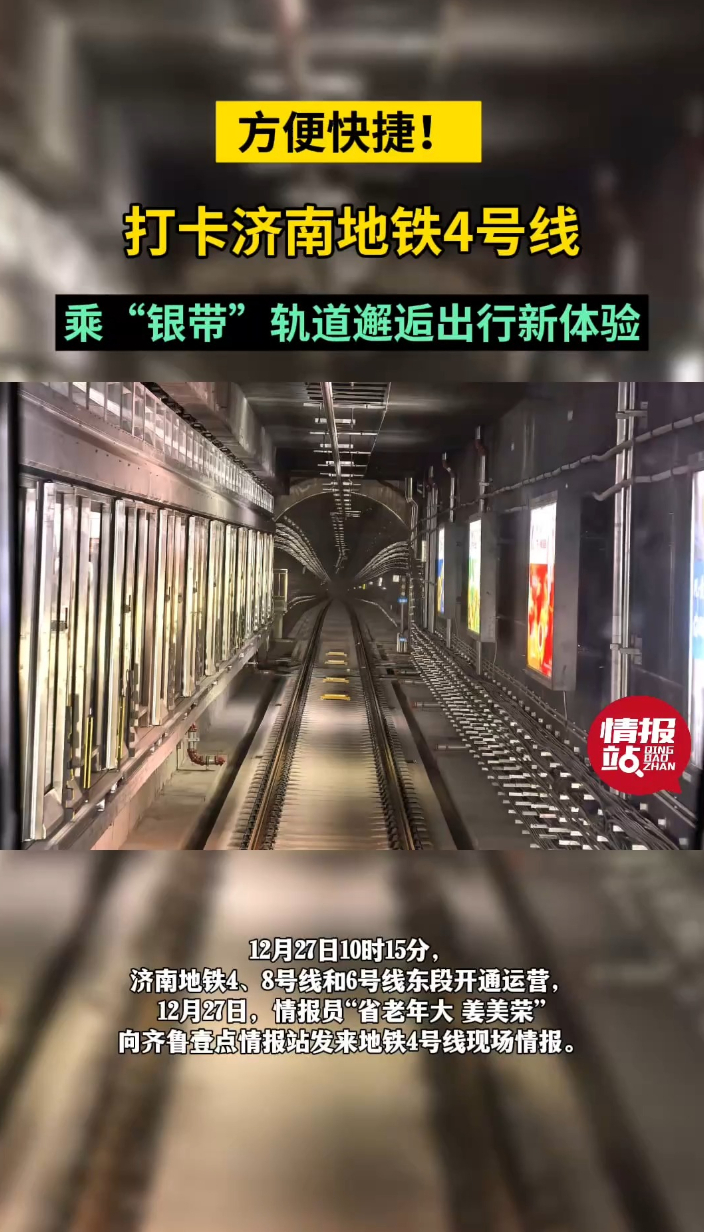 地铁情报站|打卡济南地铁4号线,乘“银带”轨道解锁出行新体验 16:40 大众报业·齐鲁壹点 微信扫码扫码下载客户端12月27日10时15分,济南地铁4、8号线和6号线东段开通运营,12月27日,情报员“省老年大 姜美荣”向齐鲁壹点情报站发来地铁4号线现场情报。“今天打卡地铁4号线,从第一医科大学至彭家庄的隧道内,轨道似银带延伸,金属构件在光影中碰撞出工业美学。这条地下线路穿梭泉城核心,周末车厢里市民扶老携幼,尽情体验便捷高效,感受城市新脉动。”情报员说。