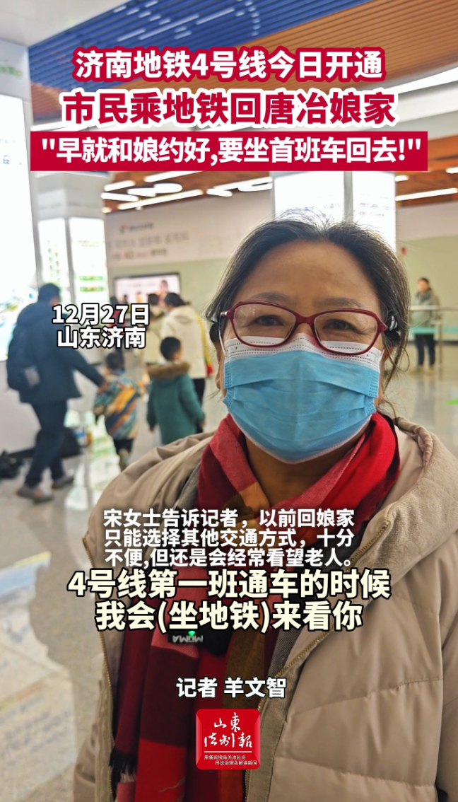 济南地铁4号线今日开通,市民乘地铁回唐冶娘家,“早就和娘约好,要坐首班车回去!” 09:37 现场大众新闻·山东法制报 微信扫码扫码下载客户端12月27日,济南地铁4号线开通运营。记者来到奥体中心站,在首班车发车前,从早已在此等候的宋女士口中了解到,她此次要搭乘首班车回唐冶的娘家。“早就跟俺娘约好会坐第一班车回去,以后回娘家看望老娘,可太方便了!”宋女士激动地说道。(大众新闻•山东法制报记者 羊文智)