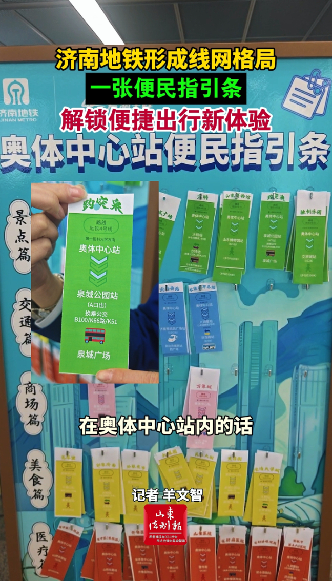 济南地铁形成线网格局,一张便民指引条,解锁便捷出行新体验 09:37 现场大众新闻·山东法制报 微信扫码扫码下载客户端12月27日,济南地铁4号线、8号线、6号线东段三条新线同步开通运营,标志着济南地铁正式形成线网运营格局。记者在4号线奥体中心站看到,不少乘客驻足便民指引条展板前查阅。地铁工作人员介绍,这些指引条全面标注了济南主要景点、商场、医院等地点的乘坐路线信息,供乘客免费取阅,为大家的出行提供便利。(大众新闻•山东法制报记者 羊文智)