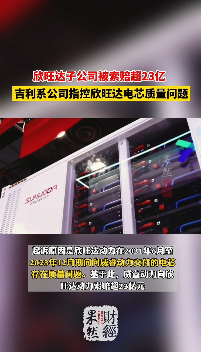 果然财经|欣旺达子公司被索赔超23亿,被指控电芯质量问题齐鲁晚报·齐鲁壹点客户端 11:01原创12月26日晚间,欣旺达(300207.SZ)发布公告称,公司子公司欣旺达动力在2025年12月25日收到民事起诉状,原告为威睿电动汽车技术(宁波)有限公司(下称“威睿动力”)。起诉原因是欣旺达动力在2021年6月至2023年12月期间向威睿动力交付的电芯存在质量问题。基于此,威睿动力向欣旺达动力索赔超23亿元。