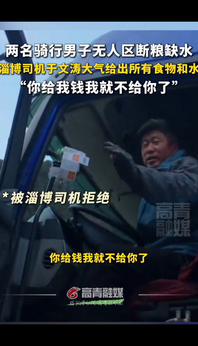 海拔4000米处,货车司机于文涛遇到两名断粮的骑行者,大方给出所有食物和水,对方执意付钱,却被一句“你给钱,我就不给你了”婉拒。为淄博司机于文涛点赞!