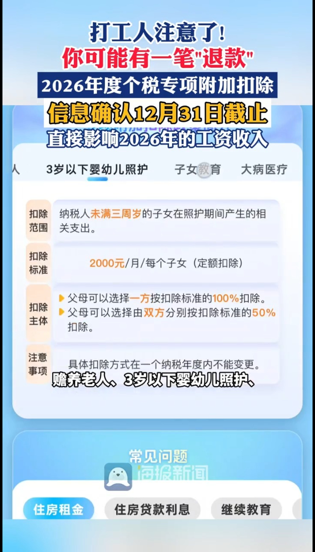 打工人注意了,你可能有一笔“退款”,2026年度个税专项附加扣除信息确认12月31日截止,还没确认的抓紧确认,直接影响2026年的工资收入!个人所得税专项附加扣除项目包括住房租金、住房贷款利息、继续教育、赡养老人、3岁以下婴幼儿照护、子女教育、大病医疗七项。