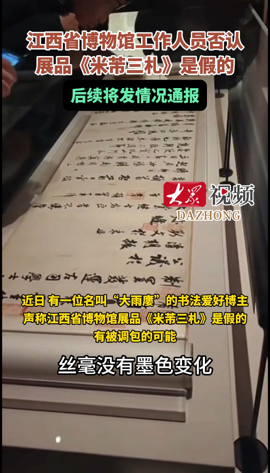 江西省博物馆工作人员否认展品《米芾三札》是假的:后续将发情况通报大众新闻 18:39独家近日,有一位名叫“大雨廔”的书法爱好博主声称江西省博物馆展品《米芾三札》是假的,有被调包的可能。针对此事,12月28日,大众新闻记者向江西省博物馆和故宫博物院进行了电话采访,故宫博院工作人员表示立刻去了解情况,江西省博物馆工作人员否认展品《米芾三札》是假的,后续将发情况通报。截至12月28日17时30分,记者发现自媒体博主已下架之前发布的视频。(大众新闻记者 高广超)