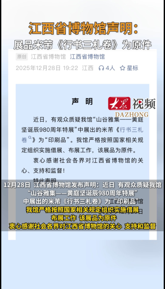 江西省博物馆声明:展品米芾《行书三札卷》为原件大众新闻 20:49原创12月28日,江西省博物馆通过微信公众号发布声明:近日,有观众质疑我馆“山谷雅集——黄庭坚诞辰980周年特展”中展出的米芾《行书三札卷》为“印刷品”。我馆严格按照国家相关规定组织实施借展、布展工作,该展品为原件。衷心感谢社会各界对江西省博物馆的关心、支持和监督!特此声明。(大众新闻记者 高广超)