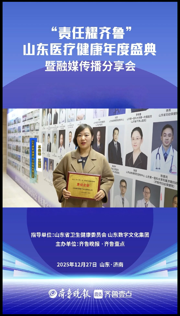2025年12月27日下午,由山东省卫生健康委员会、山东数字文化集团指导,齐鲁晚报·齐鲁壹点主办的2025“责任耀齐鲁”山东医疗健康年度盛典暨融媒传播分享会在济南大众传媒大厦举行。凭借在康养产业领域的创新突破、多元服务实践及深厚的社会责任担当,山东建邦健康产业发展有限公司(以下简称 “建邦健康”)荣膺2025年度 “责任企业” 称号,成为山东康养产业高质量发展的标杆典范。(记者 张晓丽 李晓轩)