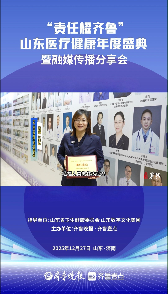 2025年12月27日下午,由山东省卫生健康委员会、山东数字文化集团指导,齐鲁晚报·齐鲁壹点主办的2025“责任耀齐鲁”山东医疗健康年度盛典暨融媒传播分享会在济南大众传媒大厦举行。中车山东风电公司凭借其在智慧康养领域的开拓性贡献与卓越社会价值,荣膺年度“责任企业”称号。这一荣誉是对中车山东风电公司以核心科技践行“连接世界造福人类”理念,主动回应国家银发经济战略的崇高礼赞。(记者 张晓丽 李晓轩)