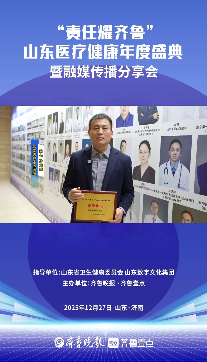济南杏林中医医院孙海岗:传承中医特色疗法,治病救人守护健康大众报业·齐鲁壹点 昨天23:152025年12月27日下午,由山东省卫生健康委员会、山东数字文化集团指导,齐鲁晚报·齐鲁壹点主办的2025“责任耀齐鲁”山东医疗健康年度盛典暨融媒传播分享会在济南大众传媒大厦举行。融合传统中医精髓与现代医疗科技,“大医精诚,仁心仁术”,济南杏林中医医院借其在中医文化发扬传承,治病救人解决病患等方面开拓性贡献与卓越社会价值,荣膺年度“责任企业”称号。(记者 张晓丽 李晓轩)