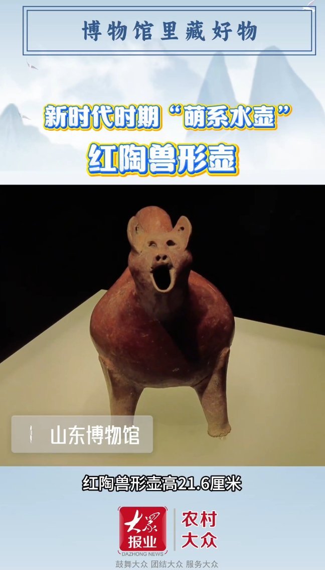 博物馆里藏好物 | 新时代时期“萌系水壶”大众新闻·农村大众 11:20原创红陶兽形壶,高21.6厘米,夹砂红陶,通体磨光,遍施红色陶衣,光润亮泽。器型圆面耸耳,拱鼻,张口,耳穿小孔,四肢粗壮,短尾上翘,背装弧形提手,尾根部一筒形注水口,嘴可往外倒水,腹部鼓起加大了容积,四足立起可供加热,使用方便,造型生动美观,逗人喜爱,集实用与仿生艺术于一身,是大汶口文化独有的器形,充满了创造性的灵感,是新石器时代一件难得的陶器珍品。(大众新闻·农村大众记者 向雨瑶)