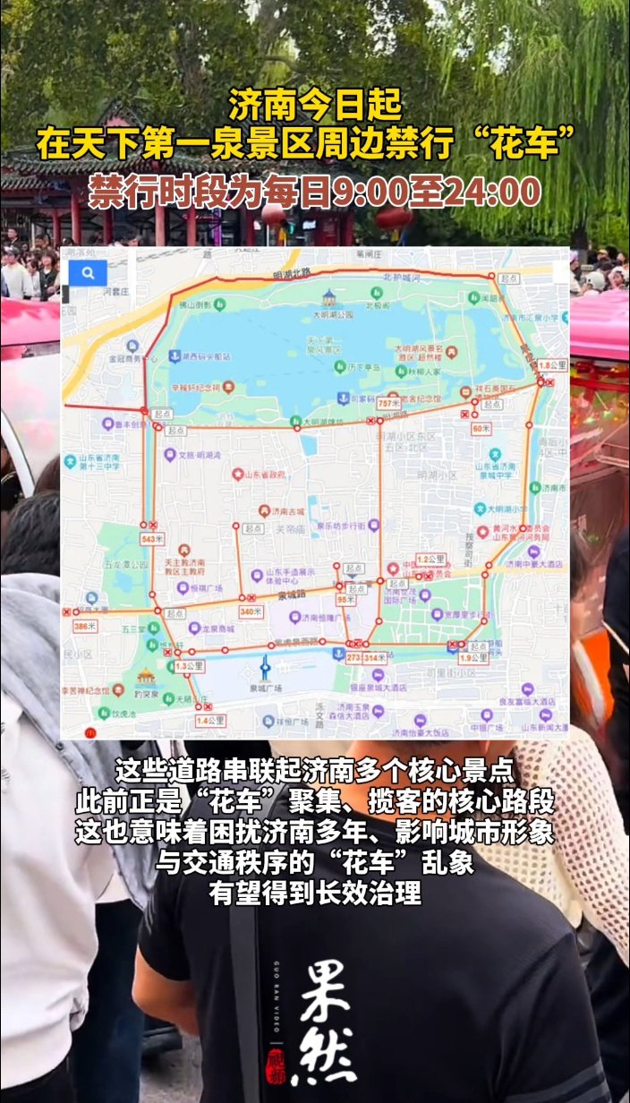 果然视频|济南今日起在天下第一泉景区周边禁行“花车”齐鲁晚报·齐鲁壹点客户端 11:16原创12月29日,济南市历下区、市中区、天桥区联合发布《关于天下第一泉风景区周边禁止动力驱动三轮车、低速四轮车通行的通告》,自即日起,每日9时至24时,在景区周边部分道路对相关车辆实施禁行管理。这也意味着困扰济南多年、影响城市形象与交通秩序的“花车”乱象,有望得到长效治理。(齐鲁晚报·齐鲁壹点 李梦瑶 石晟绮)