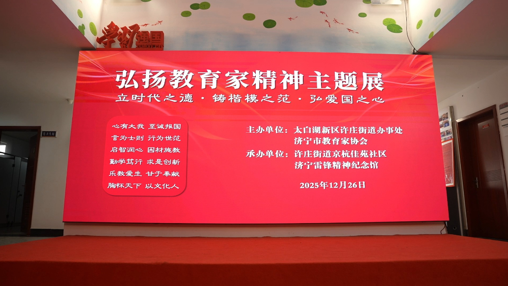 果然视频|“弘扬教育家精神主题展”走进许庄街道齐鲁晚报·齐鲁壹点客户端 10:53原创齐鲁晚报·齐鲁壹点 张清直 12月26日上午,由太白湖新区许庄街道办事处、济宁市教育家协会主办的“弘扬教育家精神主题展”在许庄街道京杭佳苑社区开幕。