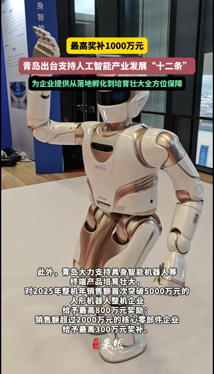 果然视频丨最高奖千万!青岛“一揽子”政策支持人工智能产业发展齐鲁晚报·齐鲁壹点客户端 16:07原创《青岛市支持人工智能和具身智能机器人产业发展若干政策措施》近日由青岛市政府办公厅印发。政策措施共12条,系统性强、集成度高,设置了从核心要素、赋能应用、产业生态、资源保障等“一揽子”支持措施,为企业提供从落地孵化到培育壮大全方位保障。(齐鲁晚报·齐鲁壹点记者 尚青龙)