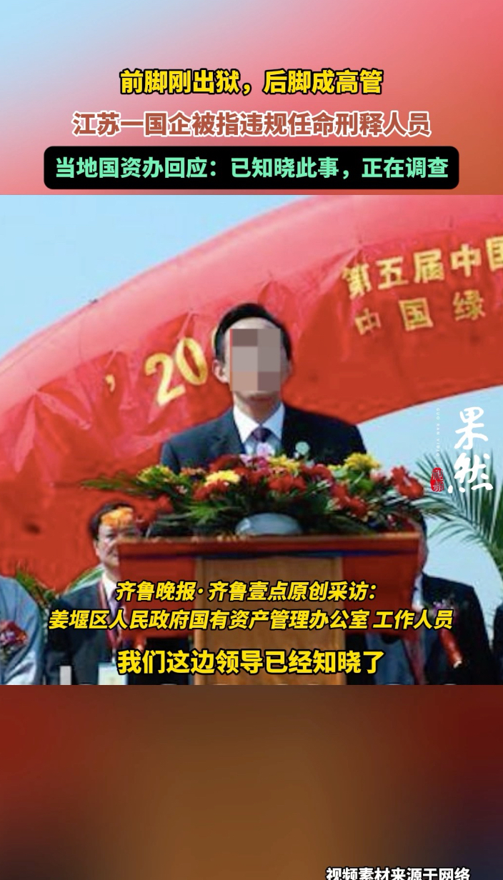 果然视频|江苏一国企被指违规任命刑释人员,当地国资办:正调查齐鲁晚报·齐鲁壹点客户端 16:56原创近日,据红星新闻报道,一年多以来,夏北公司创始人、股东王志立持续向多部门实名反映称:金东城投在参与夏北公司混合所有制改革,特别是获得夏北公司控股权后,违法违规任用刑满释放人员卜某山担任夏北公司“高管”,引发广泛关注。12月29日,齐鲁晚报·齐鲁壹点从姜堰区人民政府国有资产管理办公室获悉,已知晓此事,正在开展调查。 (齐鲁晚报·齐鲁壹点记者 路董萌)