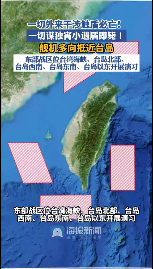 东部战区位台湾海峡、台岛北部、台岛西南、台岛东南、台岛以东开展演习。