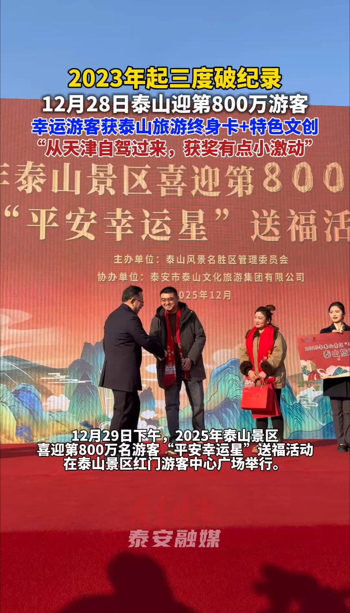 果然视频|泰山游客量连续三年突破800万人齐鲁晚报·齐鲁壹点客户端 17:40原创齐鲁晚报·齐鲁壹点 徐慧 12月29日下午,2025年泰山景区喜迎第800万名游客“平安幸运星”送福活动在泰山景区红门游客中心广场举行。据了解,12月28日下午14:30,泰山迎来第800万名游客,这是2023年以来,泰山游客量第三次突破800万人,充分彰显了泰山世界文化与自然双重遗产的独特魅力,也印证了“中华泰山 国泰民安”品牌的深厚影响力。