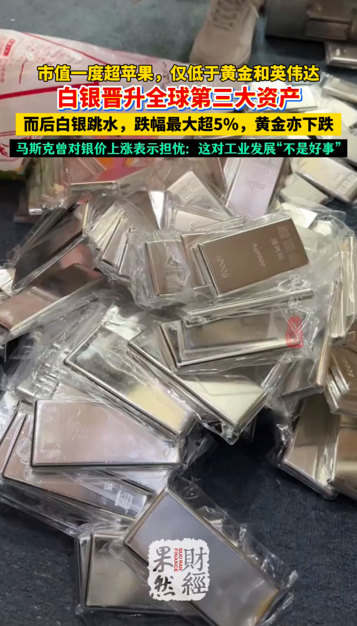 果然财经 | 白银成全球第三大资产!市值仅次于黄金、英伟达齐鲁晚报·齐鲁壹点客户端 昨天19:55原创随着白银价格不断攀升,目前该贵金属市值已超越苹果,晋升为全球第三大资产,仅低于黄金和英伟达。周一,白银市场巨震,上演了 “暴涨后急跌” 的过山车行情:现货白银开盘暴力拉升,一度上涨逾5%,随后上演高台跳水,一度跌破75美元。