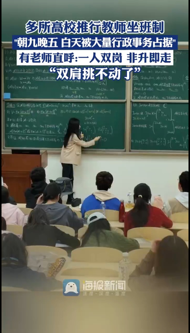 最近不少高校悄悄推行教师坐班制,要求中青年教师除了上课搞科研,还得按时按点到办公室,处理填报表、整档案这些行政事务,实实在在成了“一人双岗”!