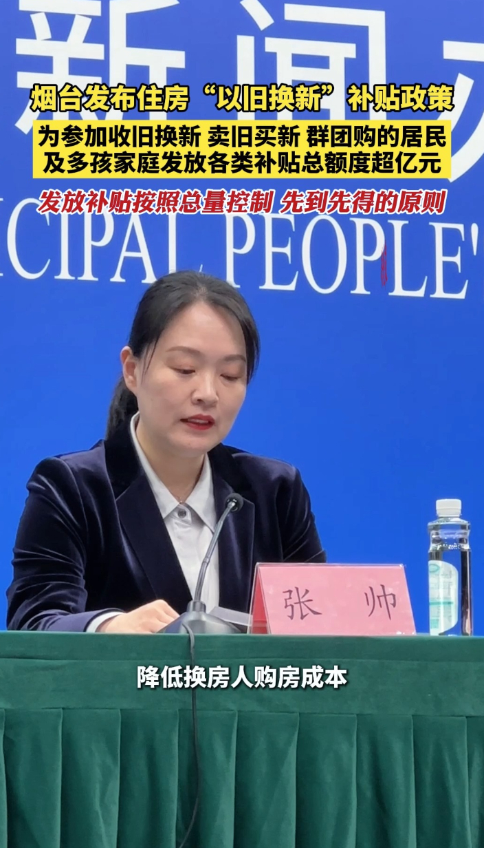 果然视频|各类补贴总额过亿!烟台发布住房“以旧换新”补贴政策齐鲁晚报·齐鲁壹点客户端 09:39原创12月29日,烟台市人民政府新闻办公室举行烟台市住房“以旧换新”新闻发布会。烟台发布住房“以旧换新”补贴政策,为参加收旧换新、卖旧买新、群团购的居民及多孩家庭发放各类补贴总额度超亿元,发放补贴按照总量控制、先到先得的原则。(齐鲁晚报·齐鲁壹点 杜晓丹)