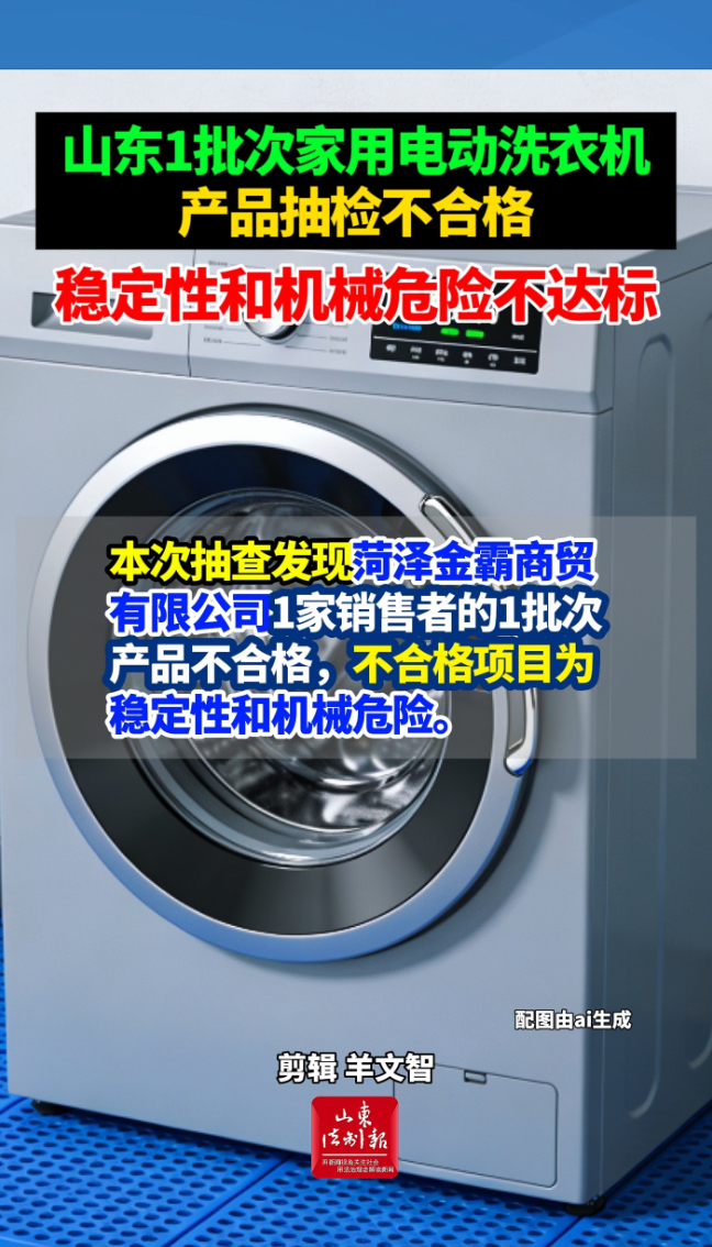 稳定性和机械危险不达标!山东1批次家用电动洗衣机产品抽检不合格 14:26 原创大众新闻·山东法制报 微信扫码扫码下载客户端12月13日,山东省市场监管局发布2025年家用电动洗衣机产品质量省级监督抽查结果。本次抽查发现菏泽金霸商贸有限公司1家销售者的1批次产品不合格,不合格项目为稳定性和机械危险。(大众新闻·山东法制报记者 羊文智)