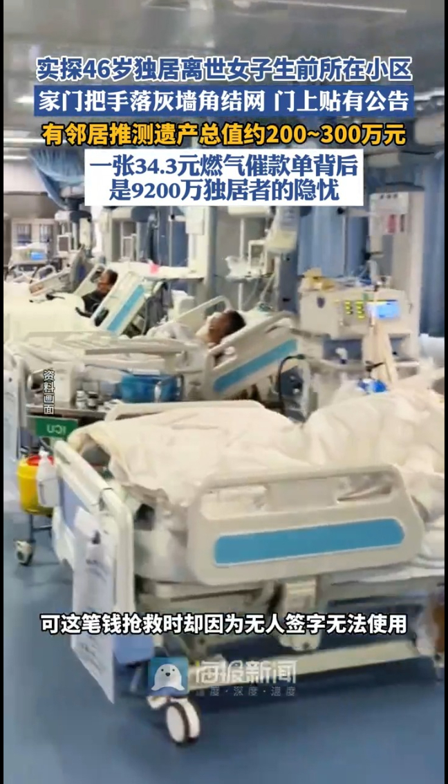 邻居回忆,蒋婷文静少言,未婚未育,父母早逝,常年独居。她猝然离世后,因没有任何法定继承人,法院指定区民政局担任其遗产管理人。老邻居推算,她留下的房产加存款约200万到300万元。她有钱有保障,可这笔钱抢救时却因为无人签字没法使用。