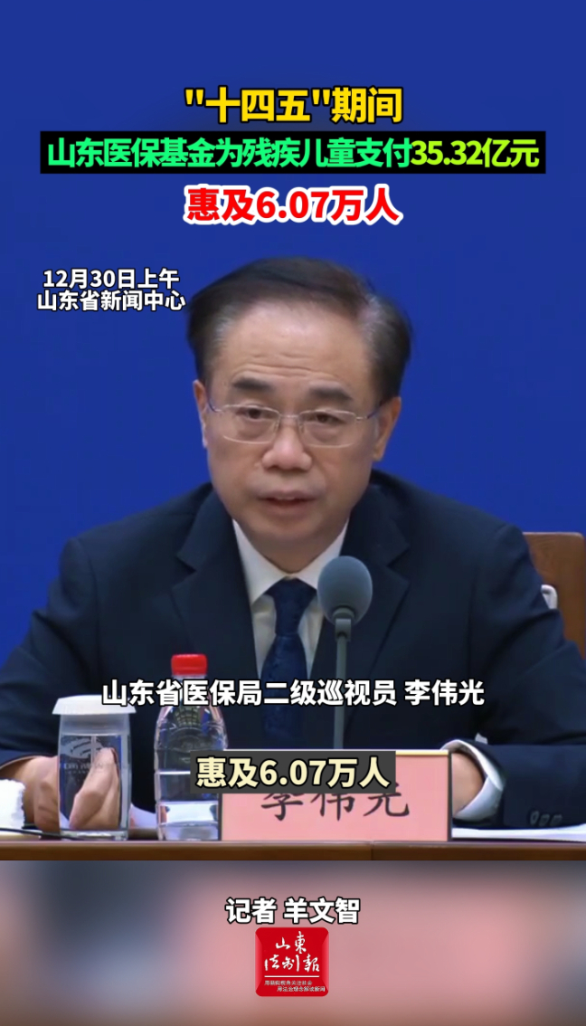 “十四五”期间,山东医保基金为残疾儿童支付35.32亿元,惠及6.07万人 16:54 现场大众新闻·山东法制报 微信扫码扫码下载客户端12月30日上午,山东省政府新闻办举行政策例行吹风会,省医保局二级巡视员李伟光会上介绍,“十四五”期间,山东医保基金累计为残疾儿童支付35.32亿元,惠及6.07万人。(大众新闻·山东法制报记者 羊文智)