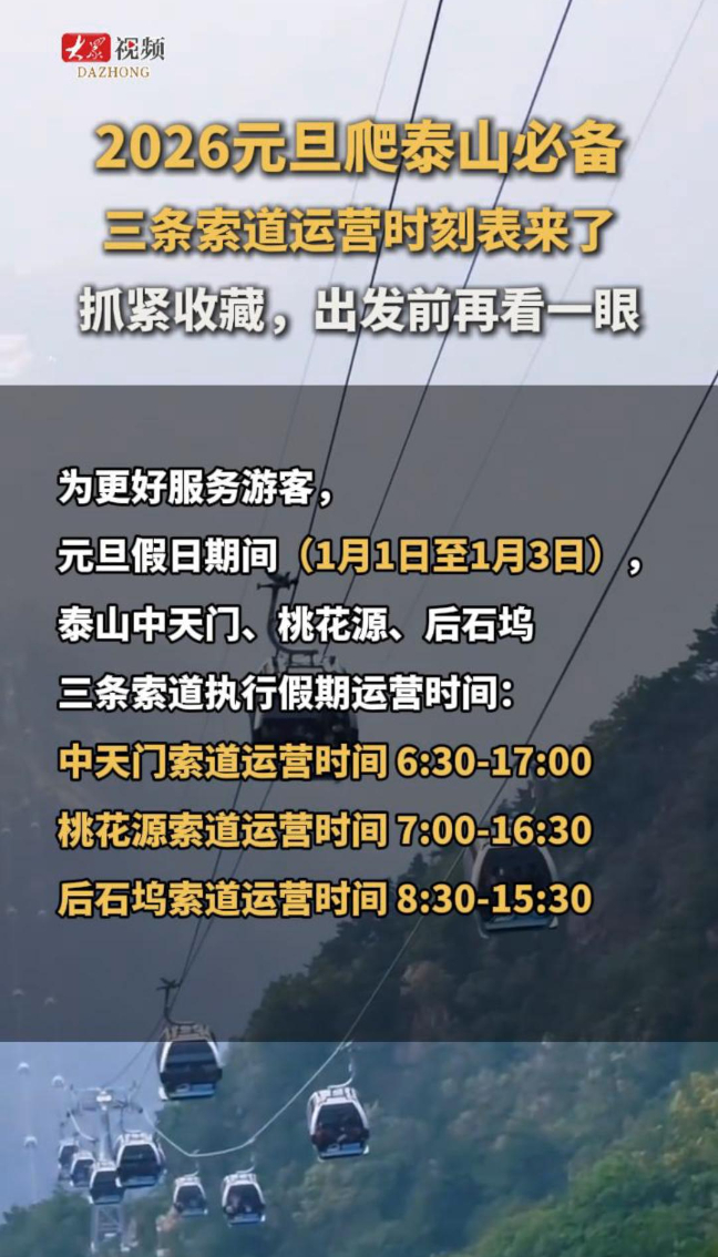 12月30日,泰山索道公司发布《泰山索道关于元旦假期运营时间的通告》,为更好地服务游客,元旦假日期间,泰山中天门、桃花源、后石坞三条索道执行假期运营时间。为确保安全,遇有恶劣天气时,索道会暂停运营。游客请及时关注天气预报和索道运营信息,合理安排行程。