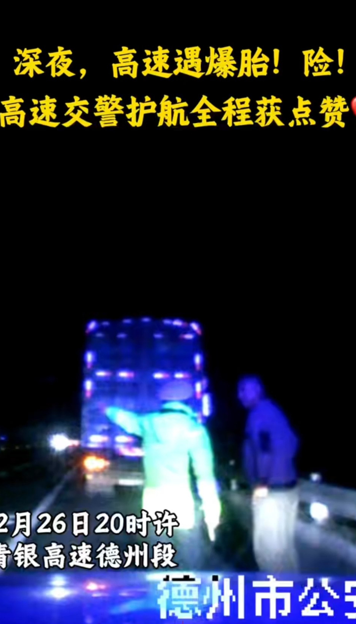 大货车高速爆胎 德州高速交警深夜全程护航获点赞齐鲁晚报·齐鲁壹点客户端 16:34原创12月26日晚8时许,一大货车行驶在青银高速德州段突发爆胎。巡检民警发现后,全程伴行护航,引导车辆就近选择下口安全驶离高速公路。大货车司机使用手机拍下温暖一幕,向民警致谢!鲁N8765警,点赞!(齐鲁晚报·齐鲁壹点 张磊)