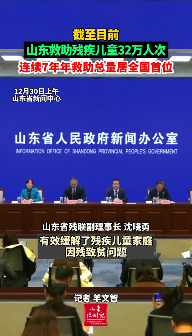 12月30日上午,山东省政府新闻办举行政策例行吹风会。记者从会上获悉,截至目前,山东已连续7年将残疾儿童康复救助纳入重点民生实事,累计救助残疾儿童32万人次。七年来,每年的救助总量均位居全国首位。