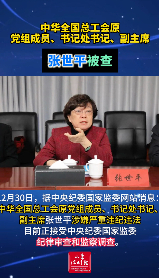年末打虎!71岁张世平被查 19:59 现场中央纪委国家监委网站 微信扫码扫码下载客户端12月30日,据中央纪委国家监委网站消息:中华全国总工会原党组成员、书记处书记、副主席张世平涉嫌严重违纪违法,目前正接受中央纪委国家监委纪律审查和监察调查。