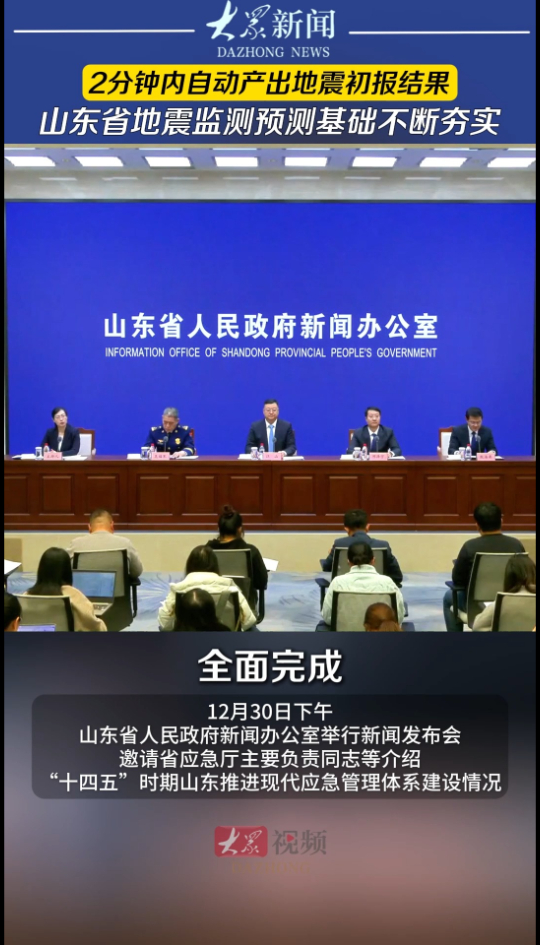 2分钟内自动产出地震初报结果,山东省地震监测预测基础不断夯实大众新闻 20:20原创12月30日下午,山东省人民政府新闻办公室举行新闻发布会,邀请省应急厅主要负责同志等介绍“十四五”时期山东推进现代应急管理体系建设情况。(大众新闻记者 申家鑫 杨烨莹 策划 马玉峰 陈巨慧)