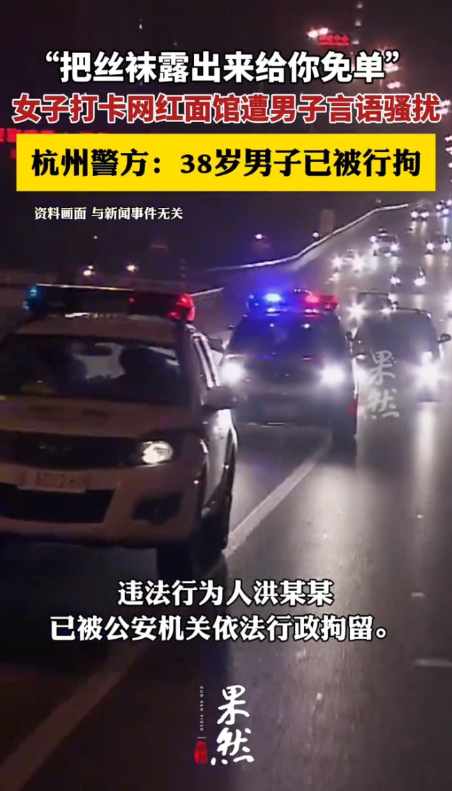 女子打卡网红面馆遭男子言语骚扰“把丝袜露出来给你免单”,杭州警方通报:洪某某(男,38岁),已被行拘齐鲁晚报·果然视频 11:00女子打卡网红面馆遭男子言语骚扰“把丝袜露出来给你免单”,杭州警方通报:洪某某(男,38岁),已被行拘