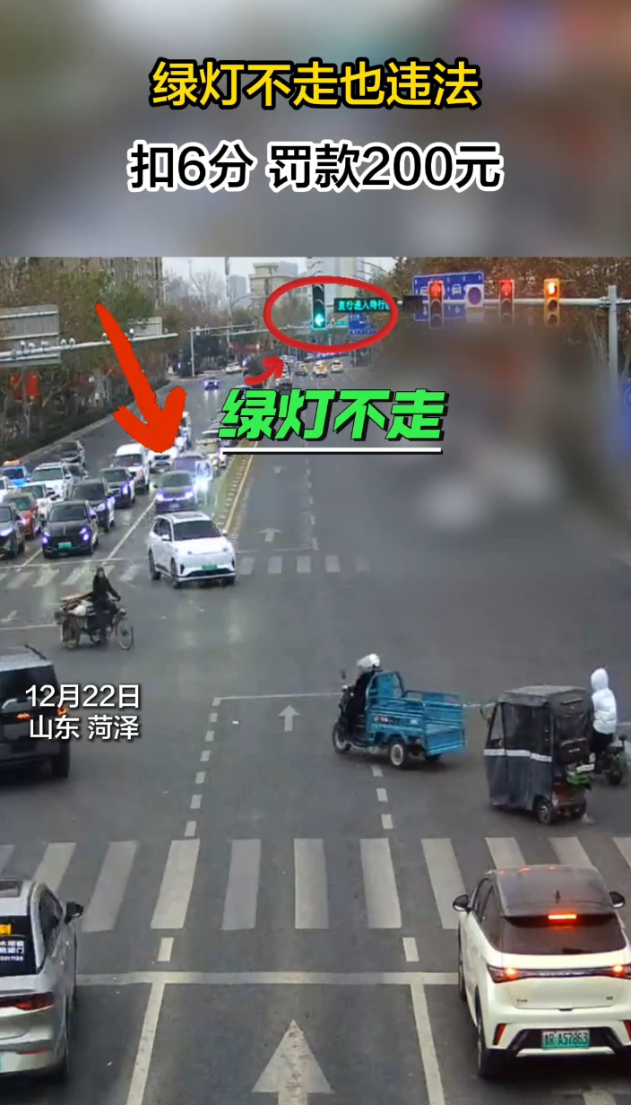 百日整治丨绿灯亮起时故意不走也违法!交警:扣6分罚款200元齐鲁晚报·齐鲁壹点客户端 17:48原创菏泽市牡丹区交管大队提醒您,对于在绿灯亮起时故意不通行,导致后面车辆无法正常通过路口的情况,按照驾驶机动车违反道路交通信号灯通行处罚,扣6分、罚款200元。