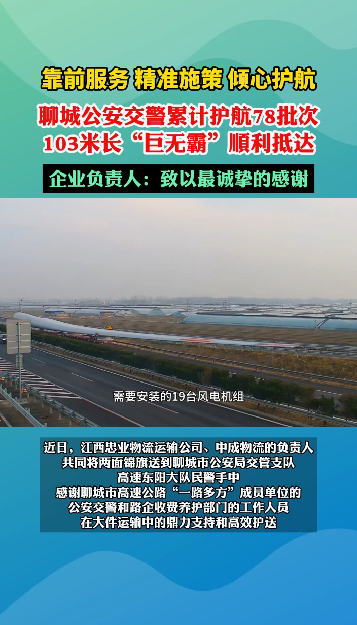 百日整治丨103米风电叶片平安出行,聊城交警硬核护航企业发展齐鲁晚报·齐鲁壹点客户端 17:45原创靠前服务、精准施策、倾心护航,聊城公安交警累计护航78批次103米长风电叶片平安抵达目的地,既有效防范了道路交通事故风险,又为企业生产建设推进赢得了宝贵时间,持续擦亮着“您来聊,我引路;您畅安,我守护”服务品牌。