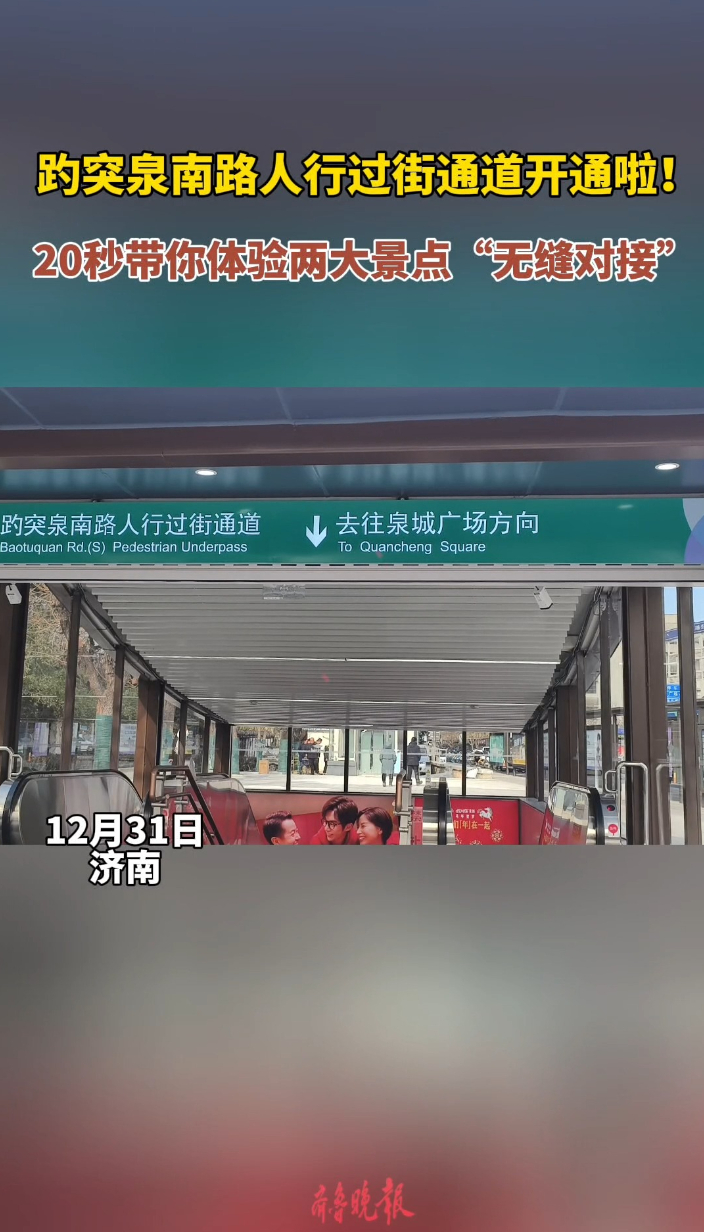果然视频|泉城广场至趵突泉地下通道开通,两大景区“无缝衔接”齐鲁晚报·齐鲁壹点客户端 18:52原创2025年12月31日,济南市趵突泉南路人行过街通道正式开放通行。中午12时左右,施工围挡已全部拆除,有不少市民前来体验。(齐鲁晚报·齐鲁壹点 见习记者 冯子芯)