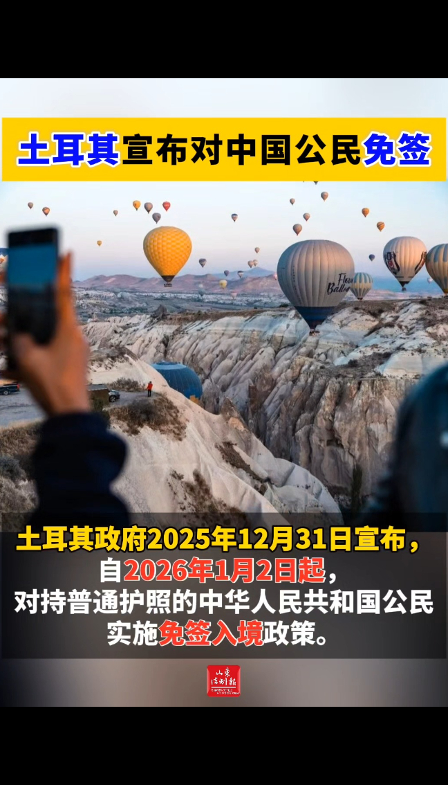 土耳其宣布对中国公民免签 昨天17:47 现场新华社 微信扫码扫码下载客户端土耳其政府2025年12月31日宣布,自2026年1月2日起,对持普通护照的中华人民共和国公民实施免签入境政策。根据官方公报,土耳其总统埃尔多安签署总统令,决定自2026年1月2日起,持普通护照的中华人民共和国公民可享受旅游和过境免签待遇,在任何180天内累计停留时间最多为90天。