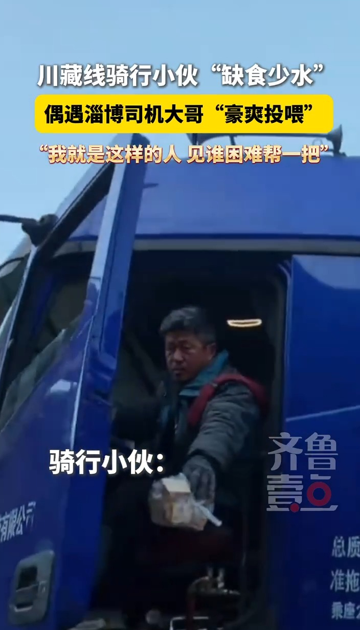 川藏线骑行小伙“缺食少水”,淄博大哥“豪爽投喂”大众报业·齐鲁壹点 12:09川藏线骑行小伙“缺食少水”,偶遇淄博司机大哥“豪爽投喂”。12月31日,记者联系到了视频中的这名货车司机于文涛,他表示,觉得自己只是做了一件微不足道的小事。“我就是这样的一个人,看谁有困难正常帮助,这是应该的。”