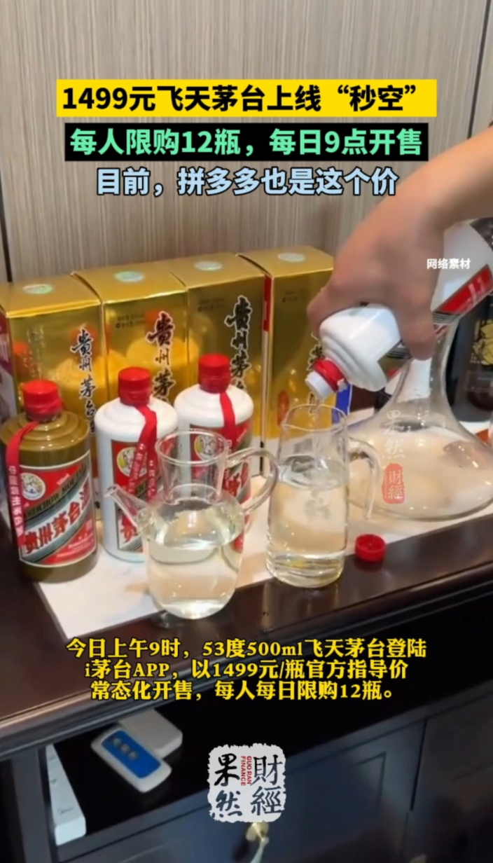 果然财经|抢疯了!飞天茅台首登i茅台,1499元就能买齐鲁晚报·齐鲁壹点客户端 14:09原创2026年1月1日,贵州茅台迎来历史性时刻。上午9时,53度500ml飞天茅台以1499元/瓶的官方指导价正式登陆i茅台APP,标志着茅台渠道改革进入新阶段。这是茅台自2022年推出i茅台平台以来,首次将核心大单品飞天茅台纳入直销体系,每人每日限购12瓶,每日上午9时准点开售。
