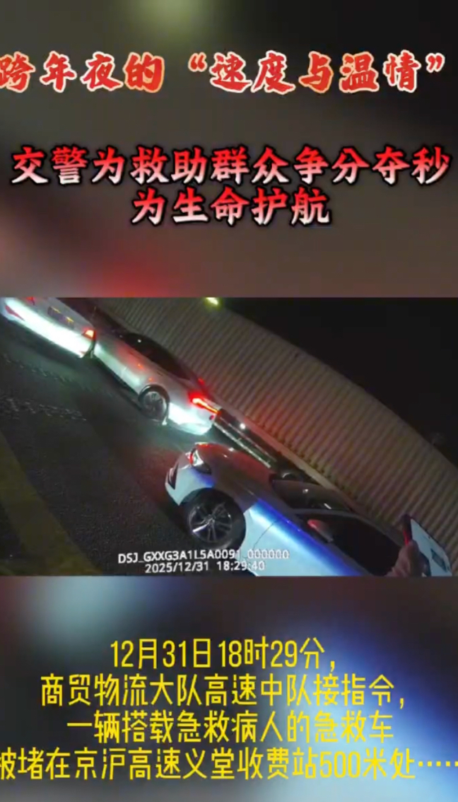 跨年夜的“速度与温情” 临沂交警为救助群众争分夺秒 18:23 大众新闻·山东法制报 微信扫码扫码下载客户端2025年12月31日下午6时29分,临沂市公安局交管支队兰山区商贸物流大队高速中队接指令,一辆搭载急救病人的急救车被堵在京沪高速义堂收费站500米处。高速中队执勤民警接到指令后,迅速与求助者联系,并第一时间为急救病人开辟通道,3分钟时间,将急救车送入京沪高速。