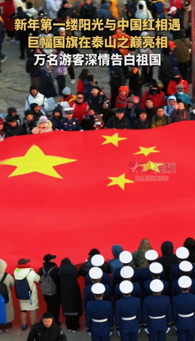 新年第一缕阳光与中国红相遇!巨幅国旗在泰山之巅亮相,万名游客深情告白祖国