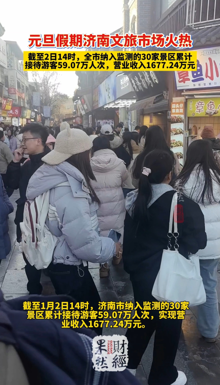 果然财经|元旦假期济南文旅市场火热,消费活力持续释放齐鲁晚报·齐鲁壹点客户端 13:07原创元旦假期,冬日的济南处处洋溢着欢乐氛围,文旅消费活力持续释放。据济南市文化和旅游局数据,截至1月2日14时,济南市纳入监测的30家景区累计接待游客59.07万人次,实现营业收入1677.24万元。