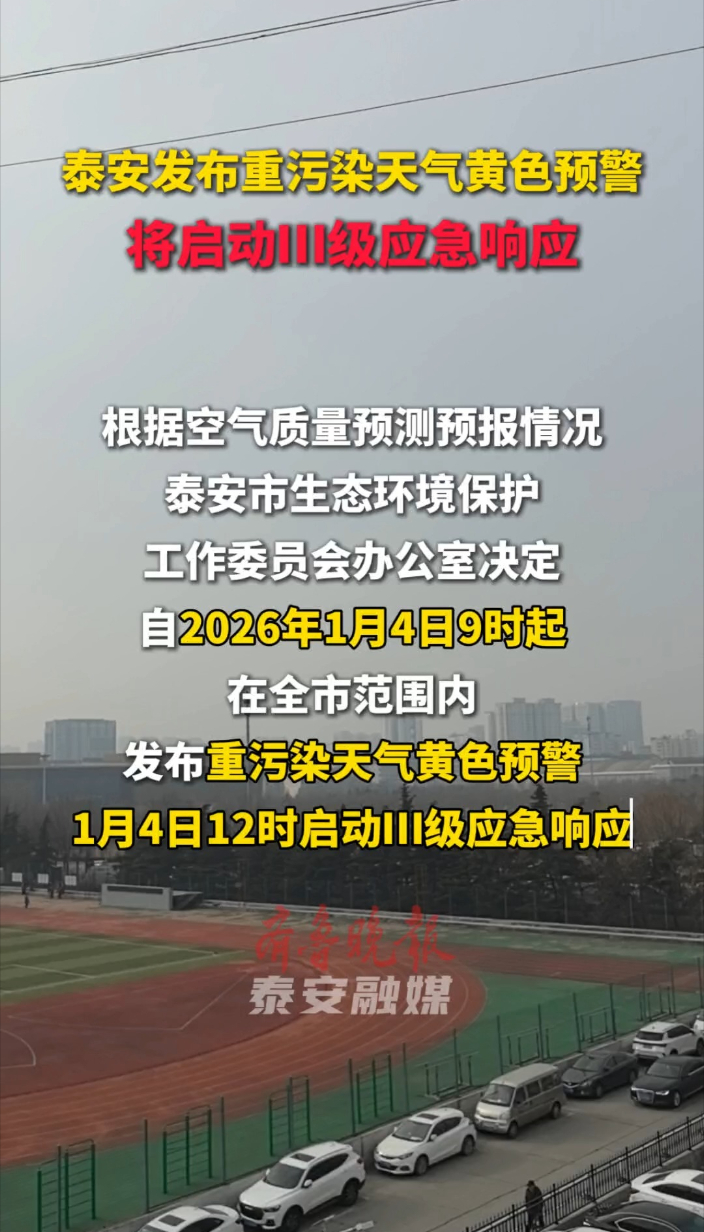 果然视频丨泰安发布重污染天气黄色预警,将启动Ⅲ级应急响应齐鲁晚报·齐鲁壹点客户端 昨天13:37原创齐鲁晚报·齐鲁壹点 郭健 根据空气质量预测预报情况,泰安市生态环境保护工作委员会办公室决定,自2026年1月4日9时起,在全市范围内,发布重污染天气黄色预警,1月4日12时启动Ⅲ级应急响应。