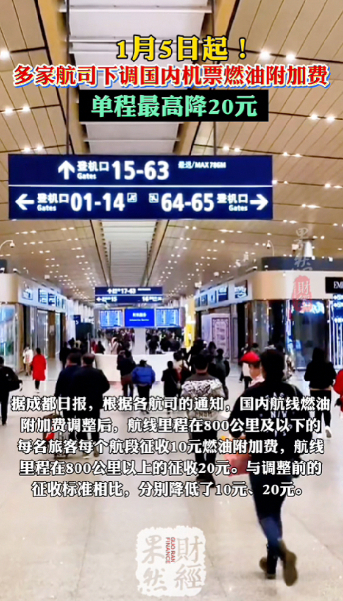 果然财经|1月5日起!多家航司下调国内机票燃油附加费齐鲁晚报·齐鲁壹点客户端 昨天15:34原创过完元旦假期,旅客预订春节假期国内机票最多将少支付20元。这是因为国航、东航、海航等多家航司纷纷发出通知,以购票时间为准,自1月5日零时起下调中国内地的国内航线燃油附加费。据成都日报,根据各航司的通知,国内航线燃油附加费调整后,航线里程在800公里及以下的,每名旅客每个航段征收10元燃油附加费,航线里程在800公里以上的征收20元。与调整前的征收标准相比,分别降低了10元、20元。