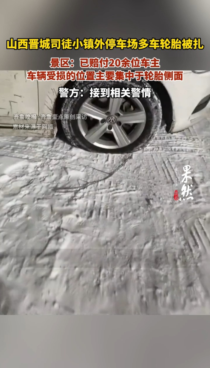 果然视频|晋城司徒小镇外多车轮胎被扎,景区已赔付20余位车主齐鲁晚报·齐鲁壹点客户端 昨天16:56原创1月2日晚,多位游客反映,在山西晋城司徒小镇景区外的停车场内,多辆汽车轮胎被扎破。4日下午,齐鲁晚报·齐鲁壹点记者从司徒小镇工作人员处获悉,景区已向20余位车主完成赔付,车辆受损的位置集中于轮胎侧面。关于寻找肇事者的事宜,工作人员称,“已经有些眉目。” (齐鲁晚报·齐鲁壹点记者 胡玲玲 路董萌)