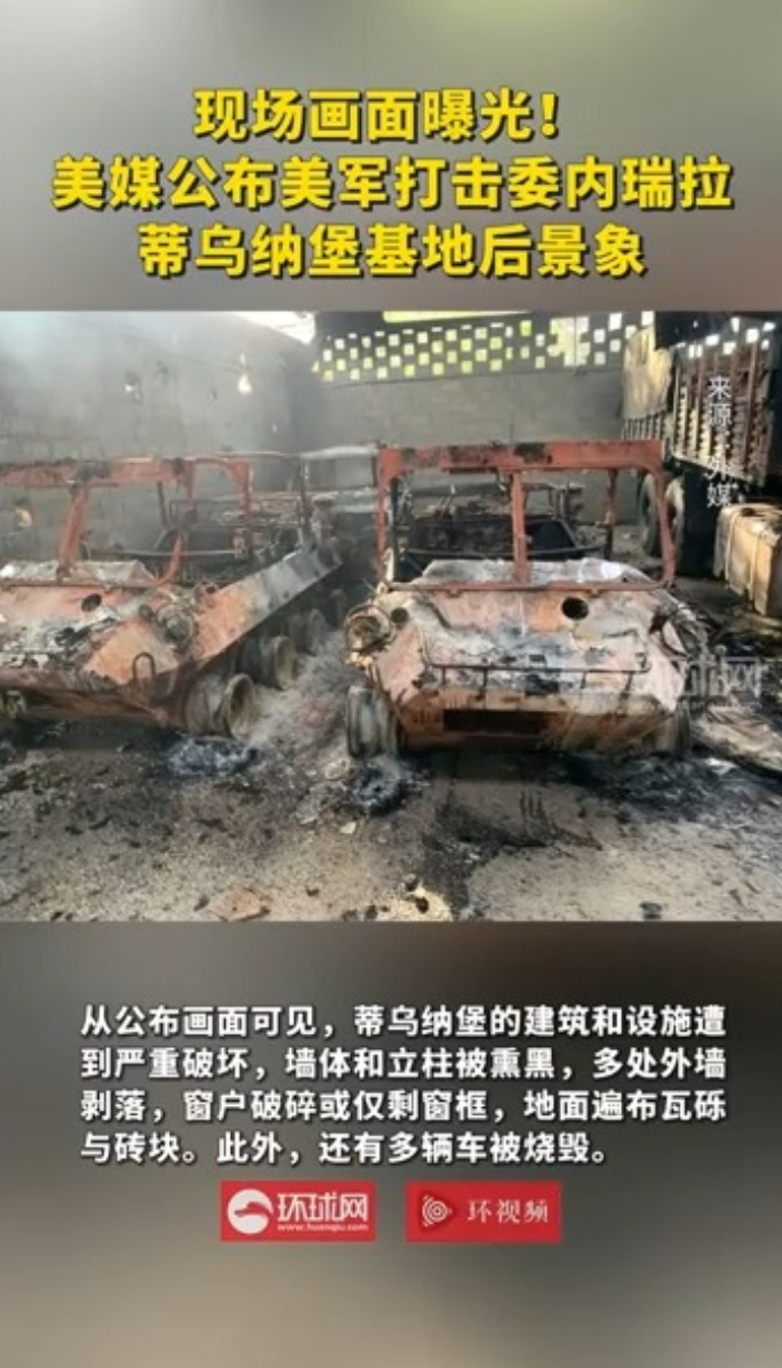 美媒公布美军打击委内瑞拉蒂乌纳堡基地后,现场画面曝光!环球网 昨天16:06美国哥伦比亚广播公司(CBS)当地时间3日公布三张照片,显示美军对位于委内瑞拉首都加拉加斯的最大军事基地蒂乌纳堡发动打击后的景象。 从公布画面可见,蒂乌纳堡的建筑和设施遭到严重破坏,墙体和立柱被熏黑,多处外墙剥落,窗户破碎或仅剩窗框,地面遍布瓦砾与砖块。此外,还有多辆车被烧毁。 (环球网)