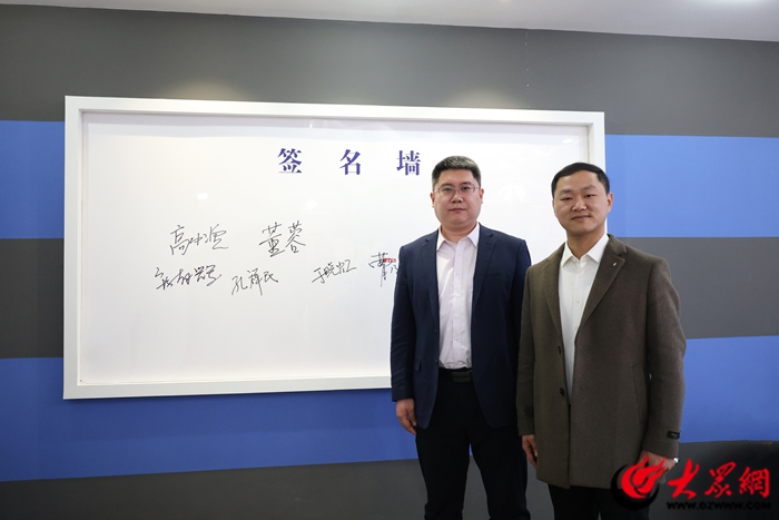 中国光大银行泰安分行党委书记、行长高中滨;山东知行智能装备有限公司总经理庞有辉做客大众网泰安演播室(记者 兰帅 摄)