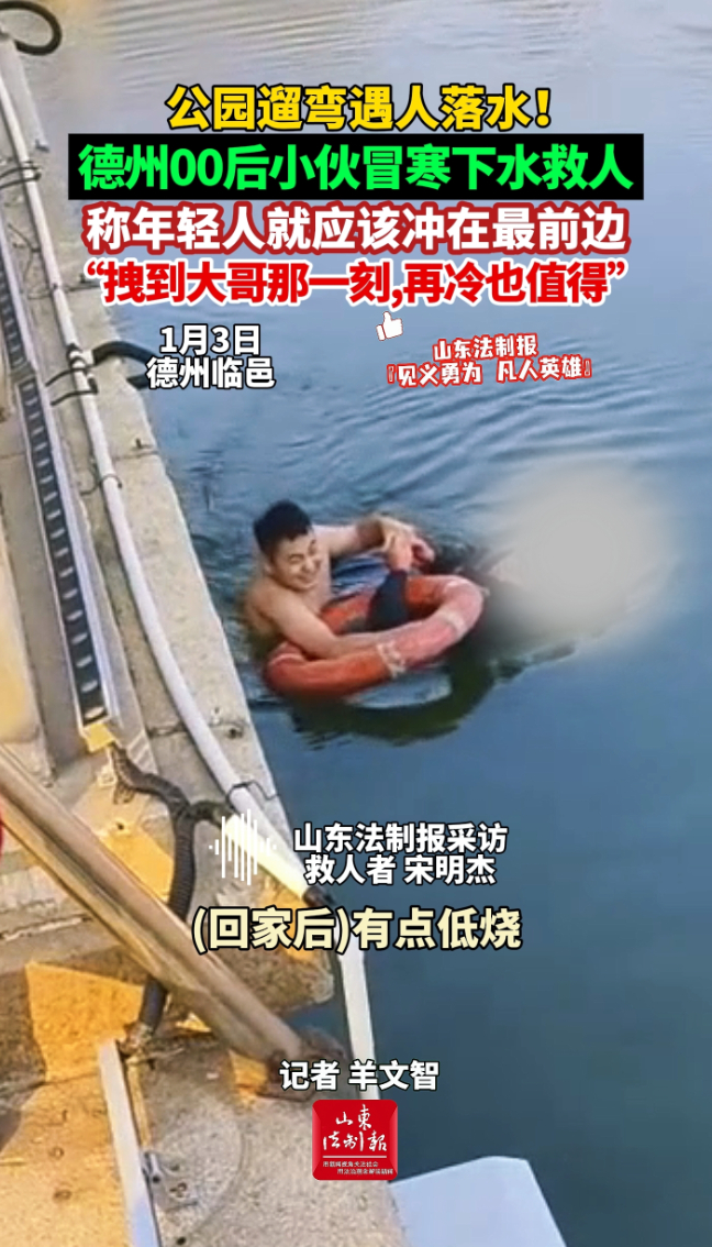 公园遛弯遇人落水!德州00后小伙冒寒下水救人,称年轻人就应该冲在最前边 01-05 原创大众新闻·山东法制报 微信扫码扫码下载客户端1月3日下午,德州临邑一处公园内,一名中年男子不慎落水。正在附近遛弯的宋明杰听到呼救声后,当即跳入冰冷的湖水中施救。他顶着湖水的寒意,吃力地一步步靠近落水男子,最终奋力将对方拽到岸边。 事后,宋明杰在接受本报记者采访时表示:“年轻人就应该冲在最前边,拽到大哥的那一刻,再冷也值得。”(大众新闻·山东法制报记者 羊文智)