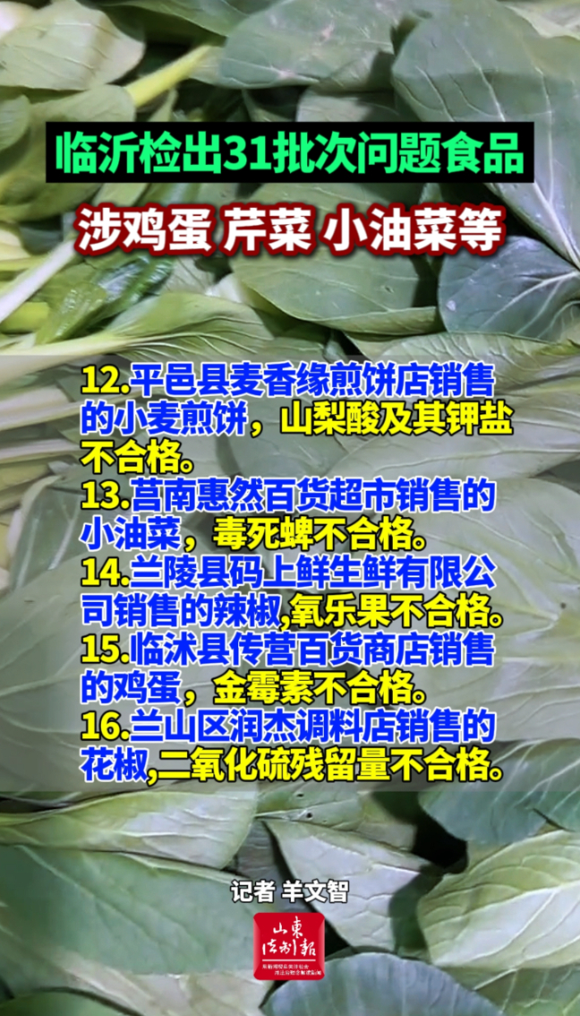临沂检出31批次问题食品,涉鸡蛋、芹菜、小油菜等