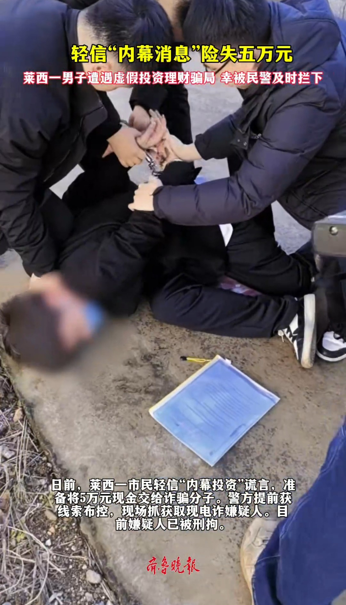 果然视频丨莱西一男子轻信“内幕投资”险被骗,交易时被民警拦下齐鲁晚报·齐鲁壹点客户端 01-05原创日前,莱西一市民轻信“内幕投资”谎言,准备将5万元现金交给诈骗分子。警方提前获取线索进行布控,现场抓获取现电诈嫌疑人。目前嫌疑人已被刑拘。 (齐鲁晚报·齐鲁壹点 宋祖锋)
